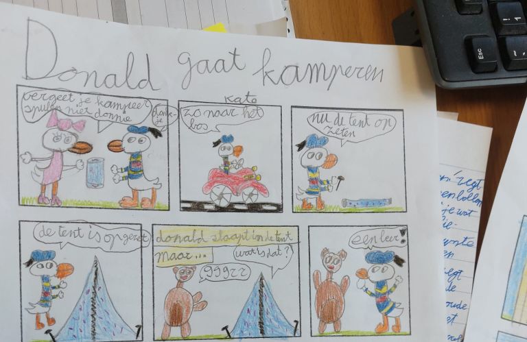 Op school werden de kinderen blij verrast toen zij Donald op het schoolplein zagen paraderen. Zijn komst inspireerde hen meteen; in alle groepen werd hard gewerkt aan avontuurlijke verhalen, stoere tekeningen en grappige strips, met Donald als hoofdpersoon. De lokalen veranderden langzaam in echte ontdekkershutten, vol fantasie en spannende ideeën.